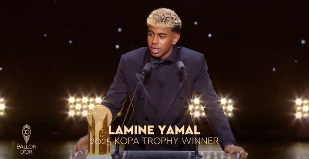 À la cérémonie du Ballon d’Or 2025, Lamine Yamal a conservé le Trophée Kopa, récompensant le meilleur joueur de moins de 21 ans au monde, pour la deuxième année consécutive. Il devance notamment Désiré Doué (PSG), qui avait marqué les esprits, notamment lors de la finale de la Ligue des Champions face à l’Inter Milan.