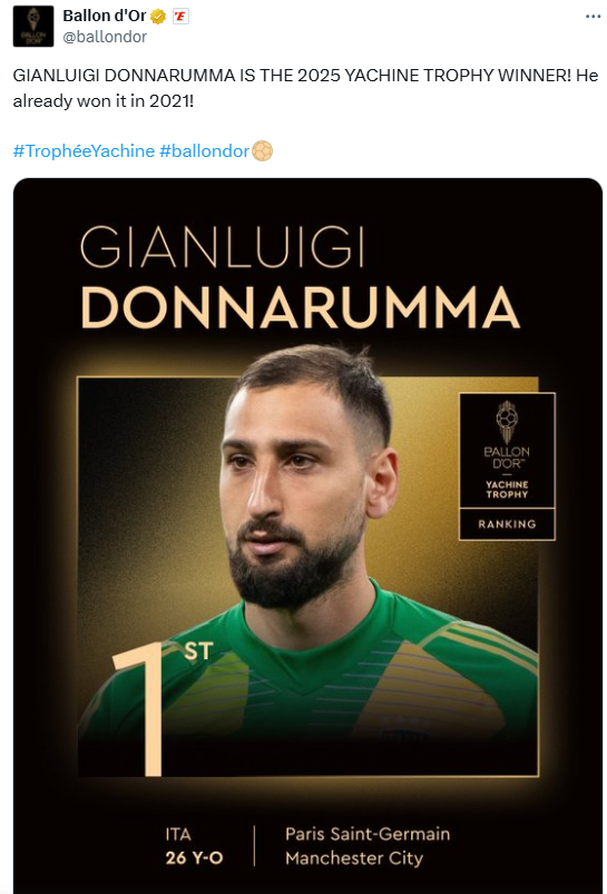 Gianluigi Donnarumma a remporté le Trophée Yachine masculin 2025 lors de la cérémonie du Ballon d’Or à Paris, décrochant ce titre individuel pour la deuxième fois après 2021.