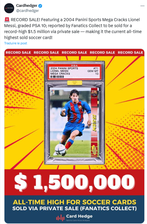 Une carte Panini 2004‑05 Mega Cracks de Lionel Messi a été vendue 1,5 million de dollars (≈ 1,28 million d’euros), établissant le nouveau record pour une carte de football.